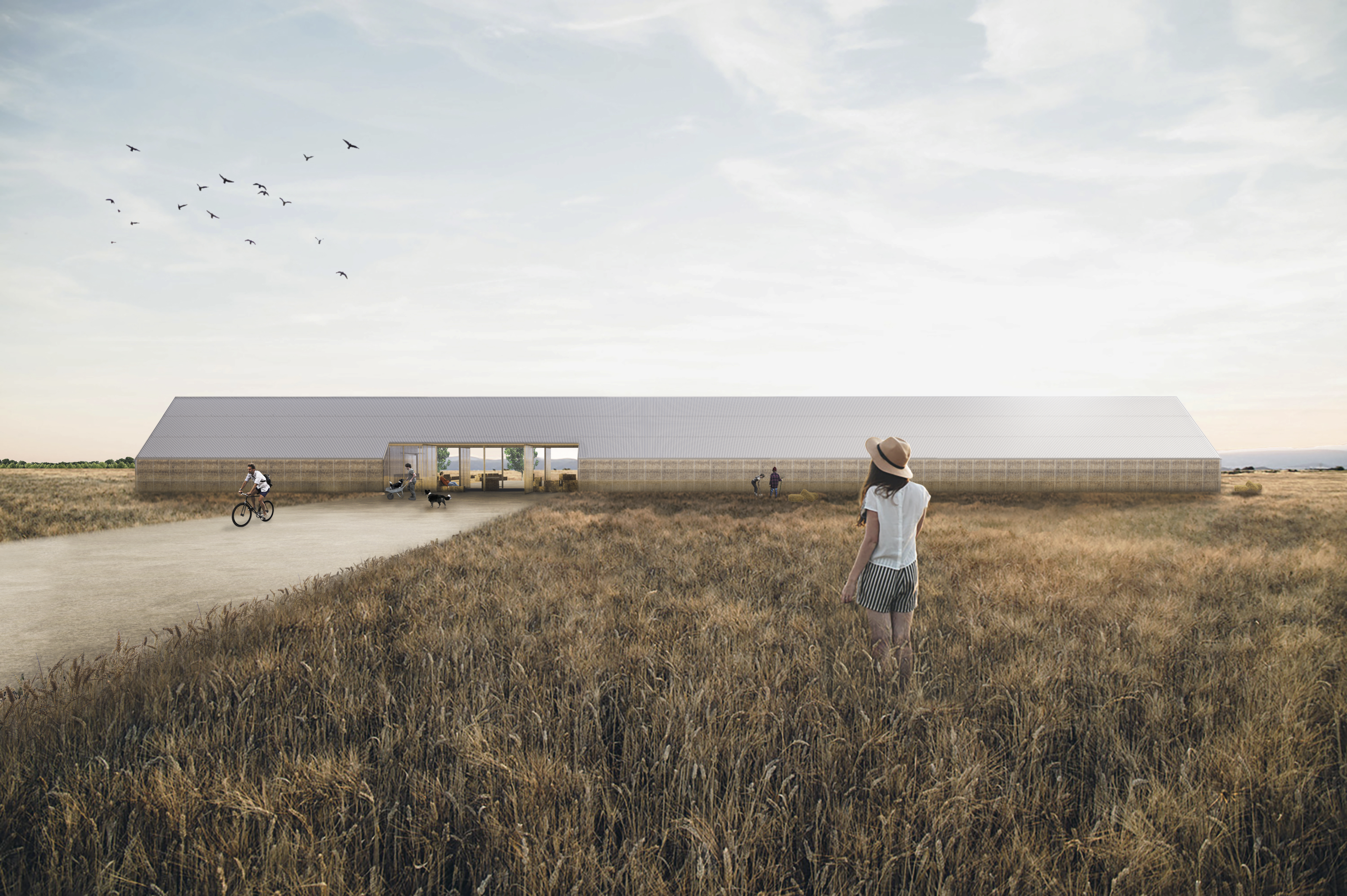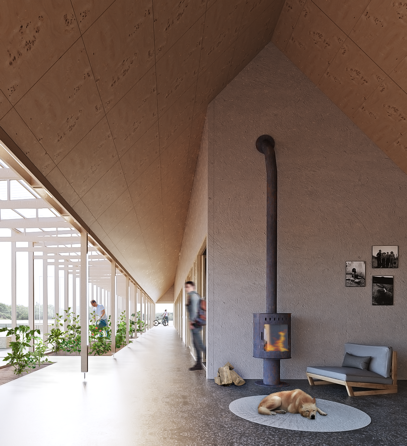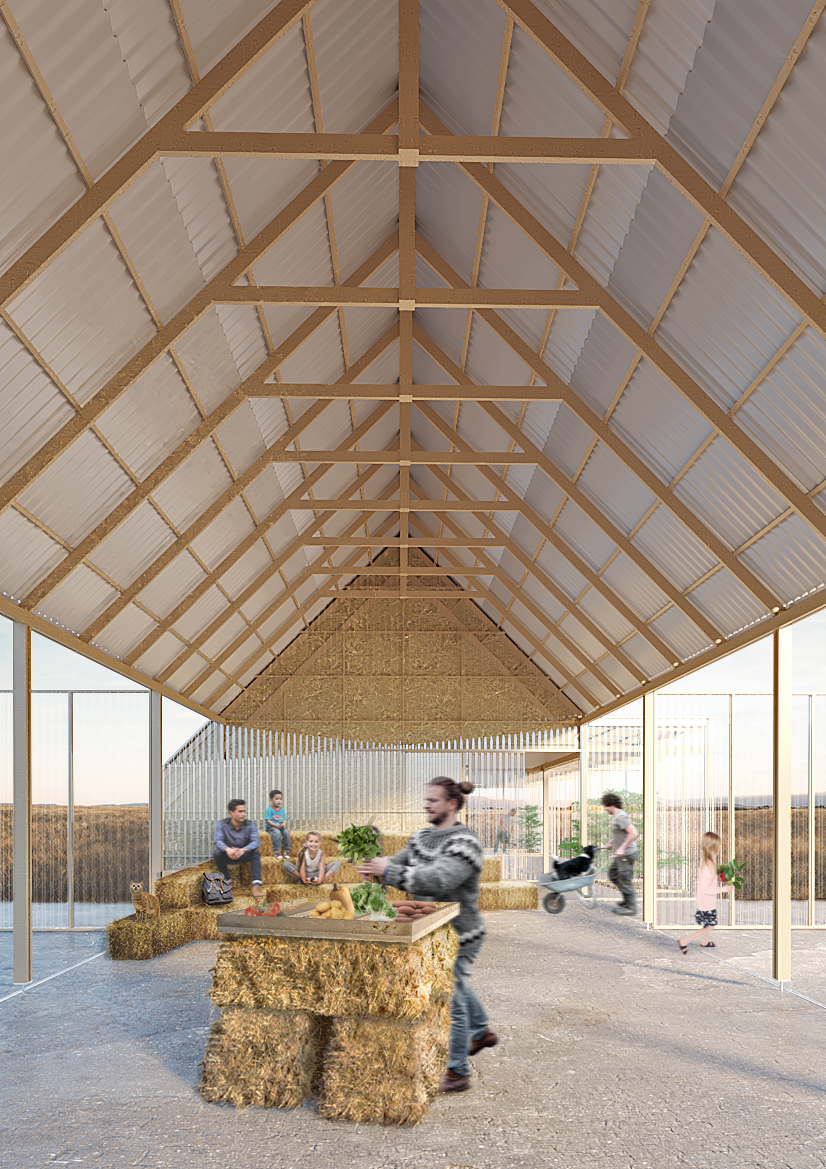 Par sa forme simple, la botte participe à la modularité de l’espace d’activité à travers différents usages, elle sert de banc pour l’homme, d’obstacle pour le dressage et de base pour la plantation de fruit et légumes. Les espaces commun du projet révèlent la paille par transparence, traduisant une volonté éco- pédagogique. Le bâtiment est pensé selon les principes bioclimatiques : Au Sud, un espace tampon générateur de chaleur, tandis qu’au Nord, une façade sans ouverture limitant les déperditions. Enfin, un toit unique vient abriter tous les occupants de cette communauté et ponctue le paysage d’un geste franc et silencieux.