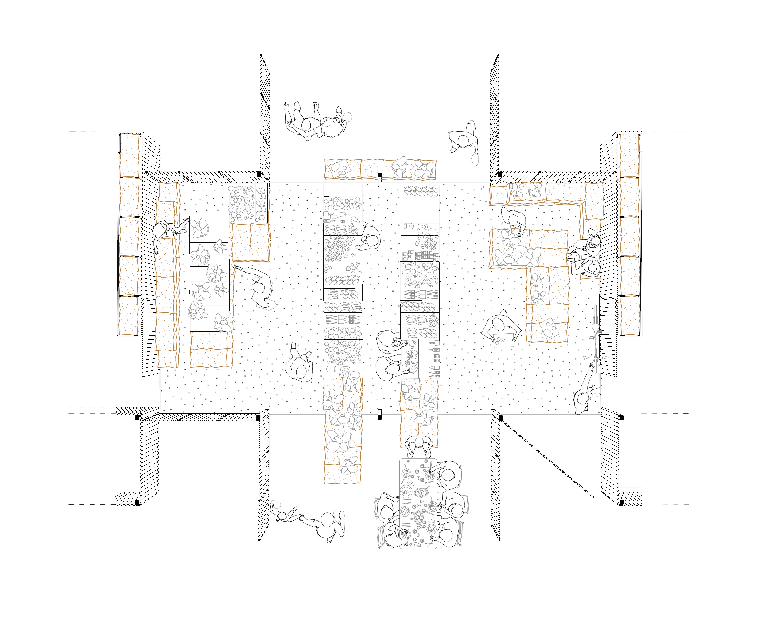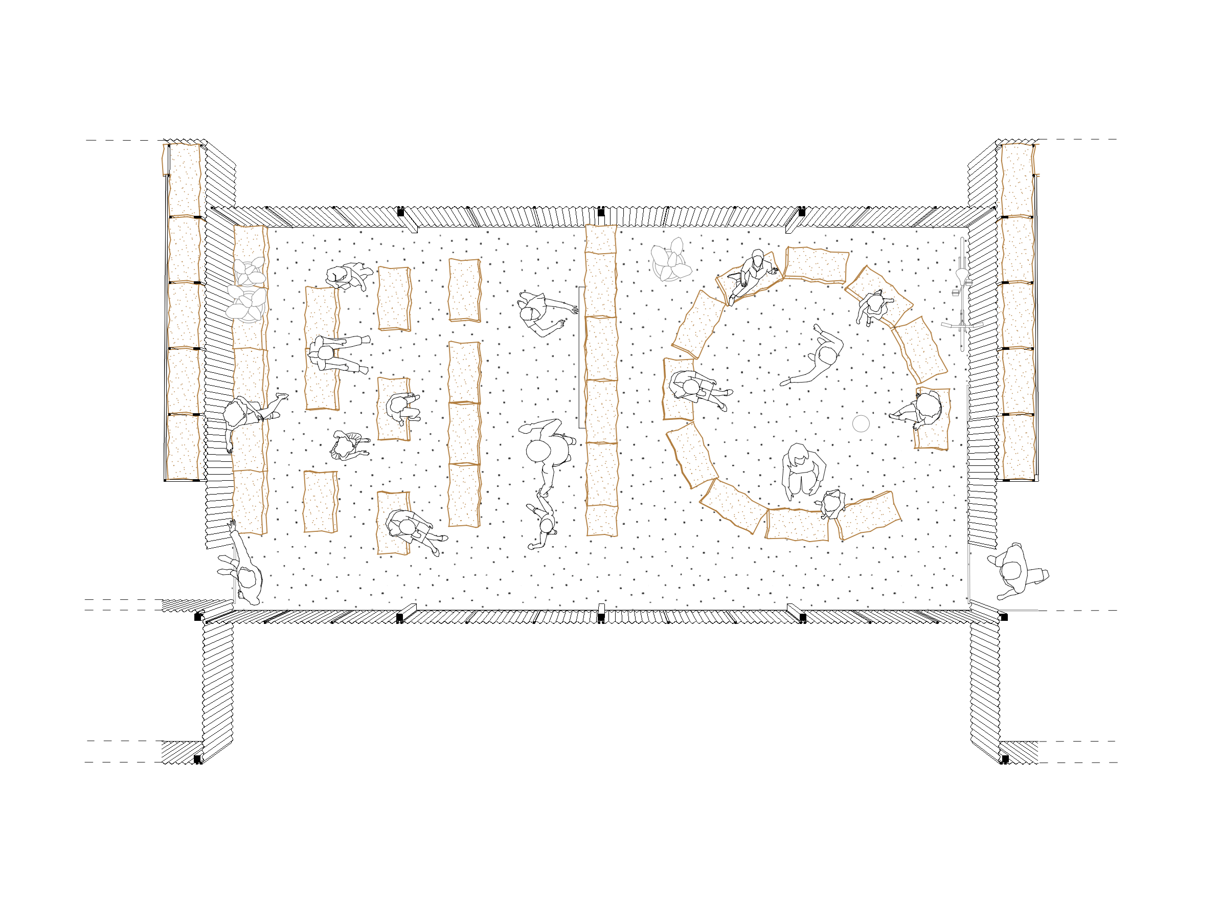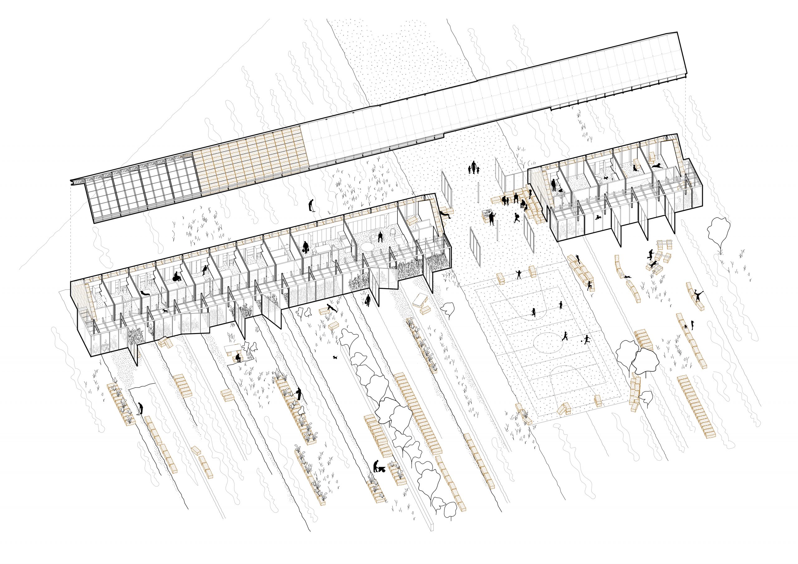 Par sa forme simple, la botte participe à la modularité de l’espace d’activité à travers différents usages, elle sert de banc pour l’homme, d’obstacle pour le dressage et de base pour la plantation de fruit et légumes. Les espaces commun du projet révèlent la paille par transparence, traduisant une volonté éco- pédagogique. Le bâtiment est pensé selon les principes bioclimatiques : Au Sud, un espace tampon générateur de chaleur, tandis qu’au Nord, une façade sans ouverture limitant les déperditions. Enfin, un toit unique vient abriter tous les occupants de cette communauté et ponctue le paysage d’un geste franc et silencieux.
