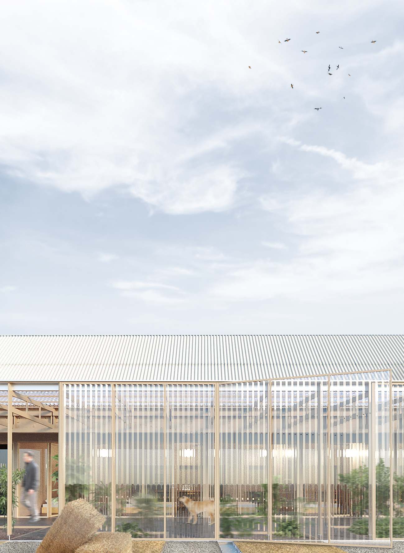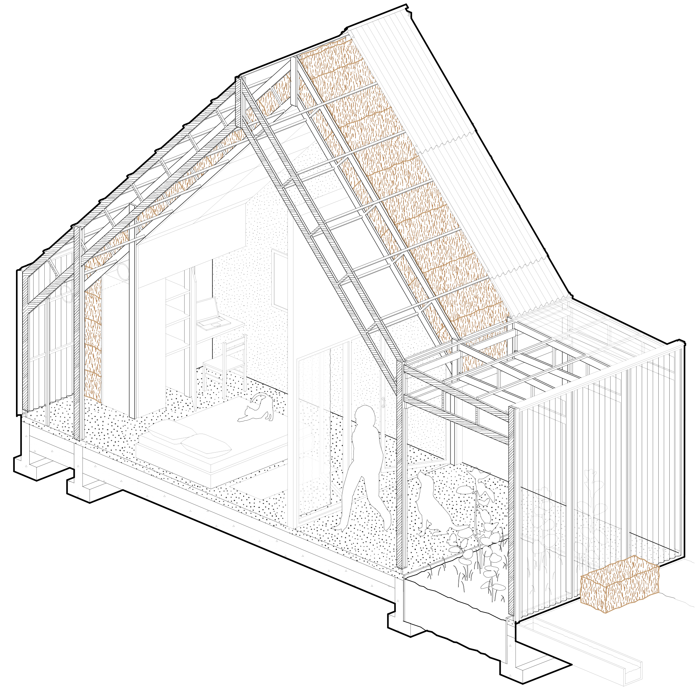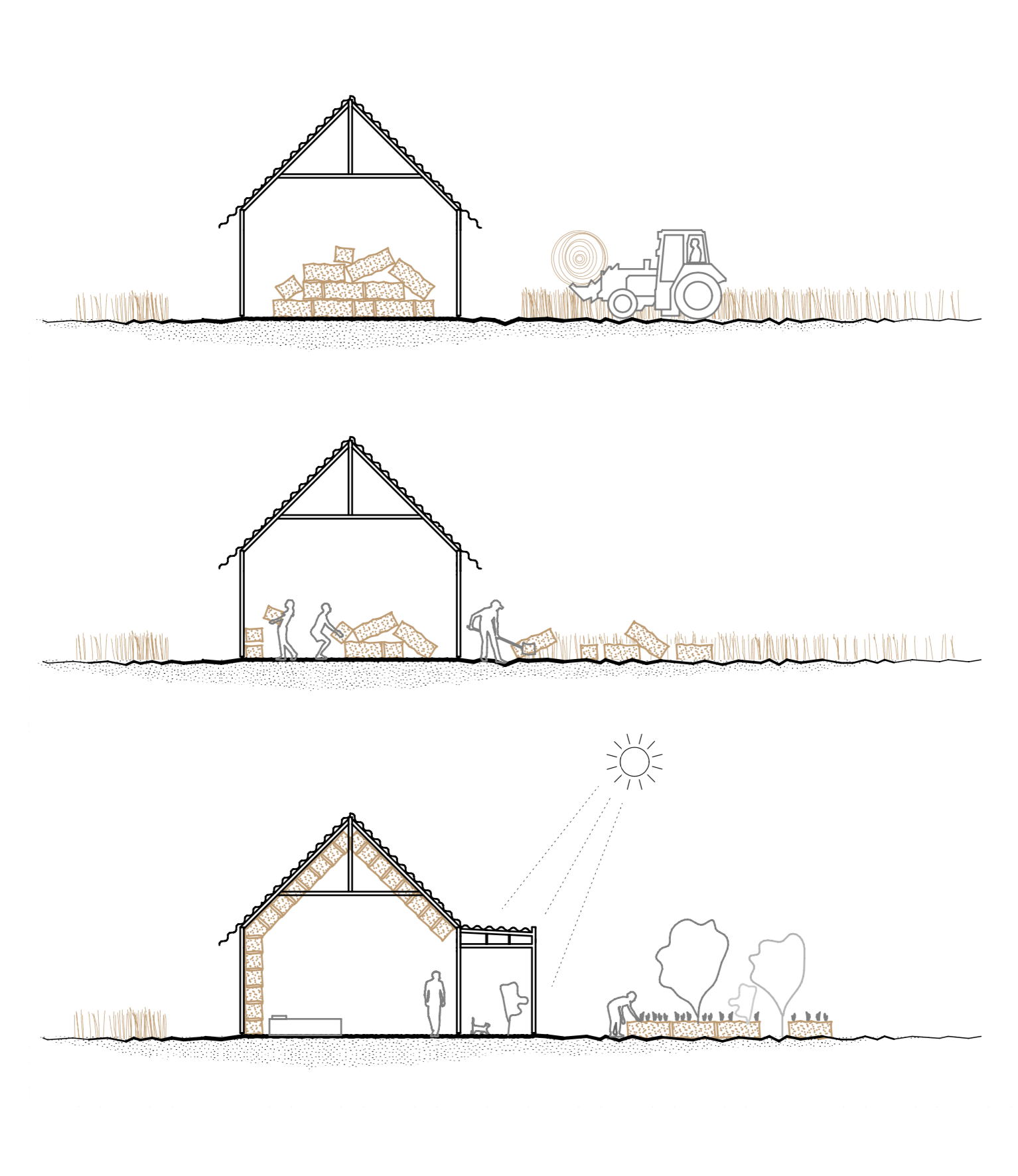 Dans le cadre du concours ARCHsharing, l’association Happy homes demande de penser une maison d’accueil qui permet à la fois d’héberger des personnes en situation d’isolement social et de recueillir des animaux abandonnés. Le principe : une aide mutuelle entre l’humain et l’animal. C’est en réponse à cette commande que le projet « botte de paille » lauréat du concours est dessiné.