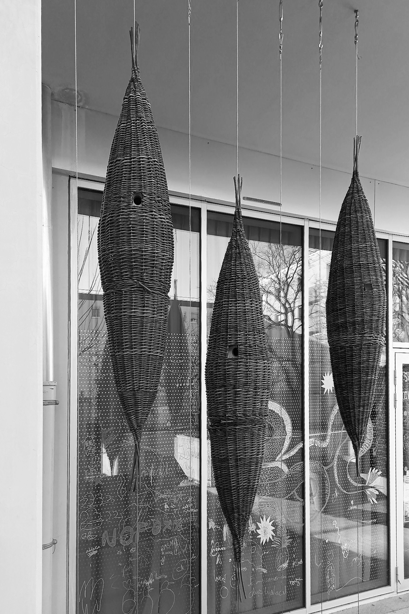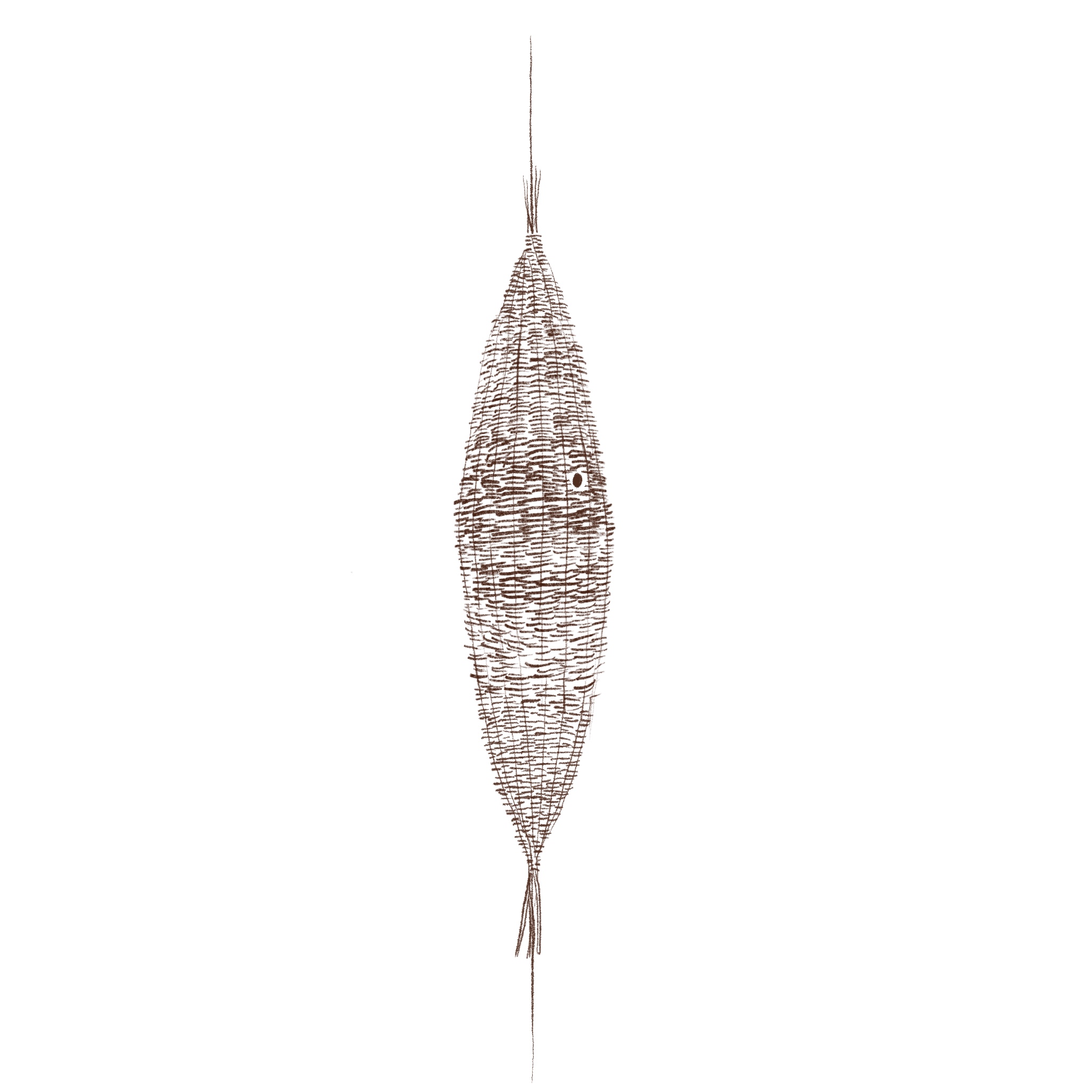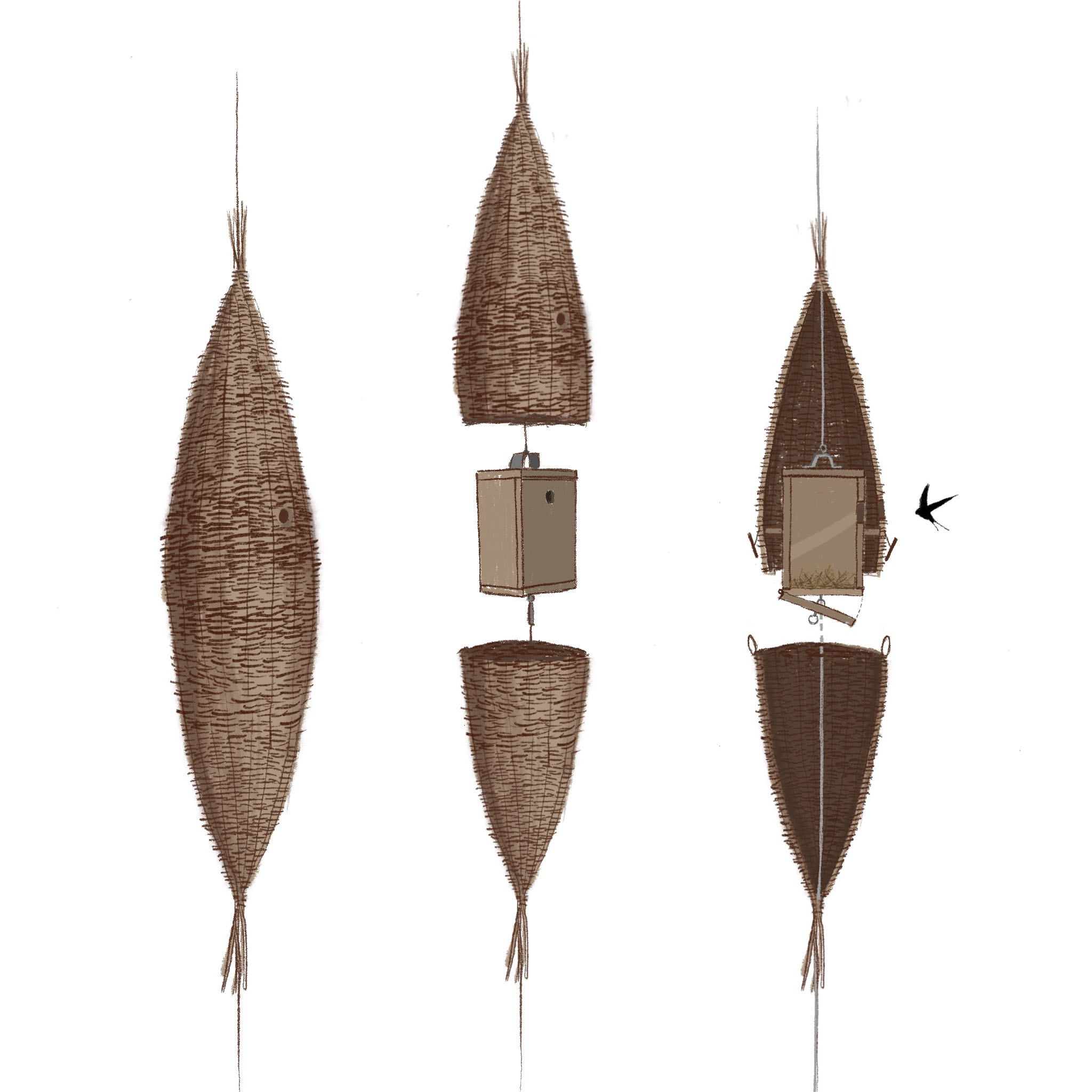 La forme du nichoir s’inspire d’un cocon, comme un abri suspendu en tension, évoquant l’intimité d’un nid. Son volume étiré rappelle les ruches coniques historiquement fabriquées par les vanniers bretons. Une boîte en bois, ornée d’un tressage en osier réalisé par l’atelier de Caroline Chomy, offre aux oiseaux un nouveau refuge.